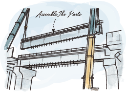 橋台・橋脚といった、橋桁を支える構造物を造ります。鉄筋