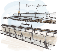 下のコンクリートの部分、伸縮装置は、橋台と橋桁の隙間に