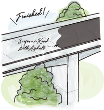 車や人が通りやすいようにアスファルトが敷かれ橋の完成です。発注者の検査を受けるために橋を綺麗に清掃して検査を受けます。検査が無事終わると開通です。地域の方々に『便利になったね』と言われるのが一番嬉しい瞬間です。