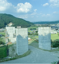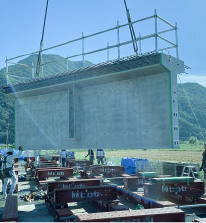 出来た橋台・橋脚に、支承装置を取付ます。沓(シュウ)と呼ばれるゴムを取付けます。これは、下部構造物(橋台・橋脚)は地盤に固定された構造で、上部構造は気温や気候で伸び縮みするので、その動きを吸収するための装置です。